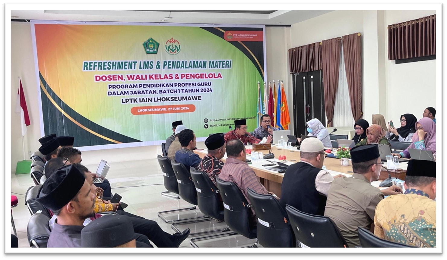 Rangkang Belajar | Lhokseumawe, 27 Juni 2024 - PPG IAIN Lhokseumawe sukses menyelenggarakan kegiatan bertajuk "Refresment Learning Management System dan Pendalaman Materi" untuk Dosen, Wali kelas, dan Pengelola Program Pendidikan Profesi Guru dalam jabatan Batch 1 Tahun 2024. Acara ini berlangsung di Operational Room di lantai dua gedung Rektorat.